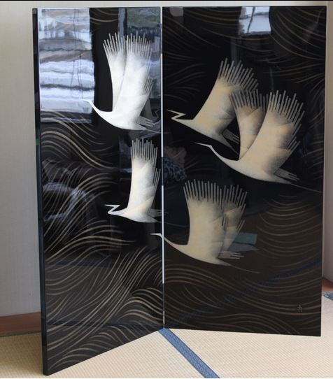 二つ折屏風 飛翔沈金がヤフーオクションにて販売されております。