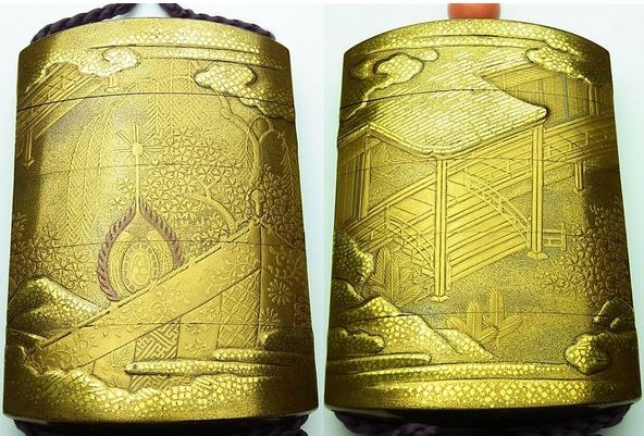 初音 蒔絵 本珊瑚 緒締 四段 印籠